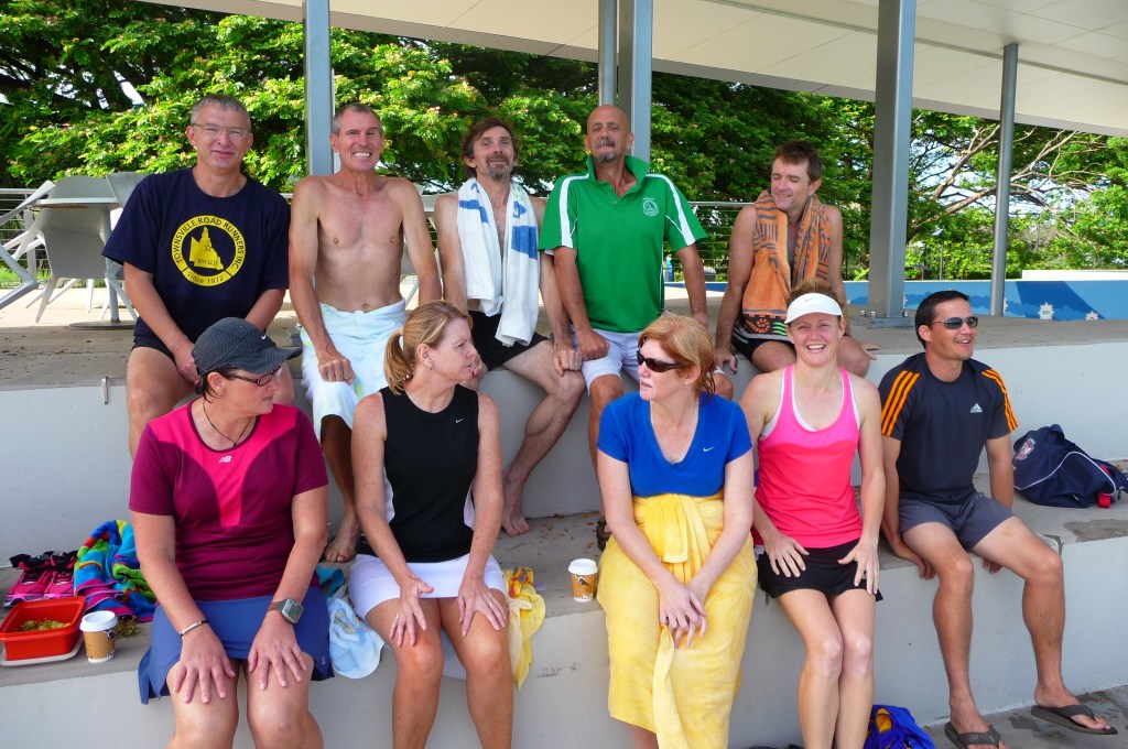 Pete Neimanis and me, back row, second and third from left, with other Sunday Long Runners, after a dip at Townsville’s Riverway pool in 2011